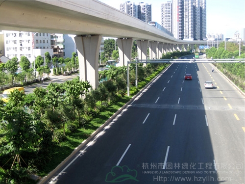 該工程最大的特色和亮點為:“以人為本,尊重自然”、“ 處處有綠葉,無處不飛花”等自然生態(tài)的設(shè)計理念貫穿始終;中央綠化帶位于高架橋下,長勢茂盛的各類植物形成一條繽紛絢麗的彩帶擁簇著高架橋段,使整條橋段與綠化景觀有機融合。2012年,該工程榮獲中國風景園林學會“優(yōu)秀園林綠化工程金獎”。