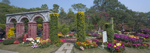 作品最大特色之處在于對原地形的充分利用及合理改造,依山勢,按水理,精細打造每一個駐步休憩之所,搭配這種菊花,或色彩,或形狀,以此營設自然而又不失韻味的菊花景觀。最后,讓人融入其中,步伐、氣息、身影混雜交錯,展示出城市生活中人們努力追求或回憶的一種起居文化,亦或是一種清凈、淡雅的“和”文化。